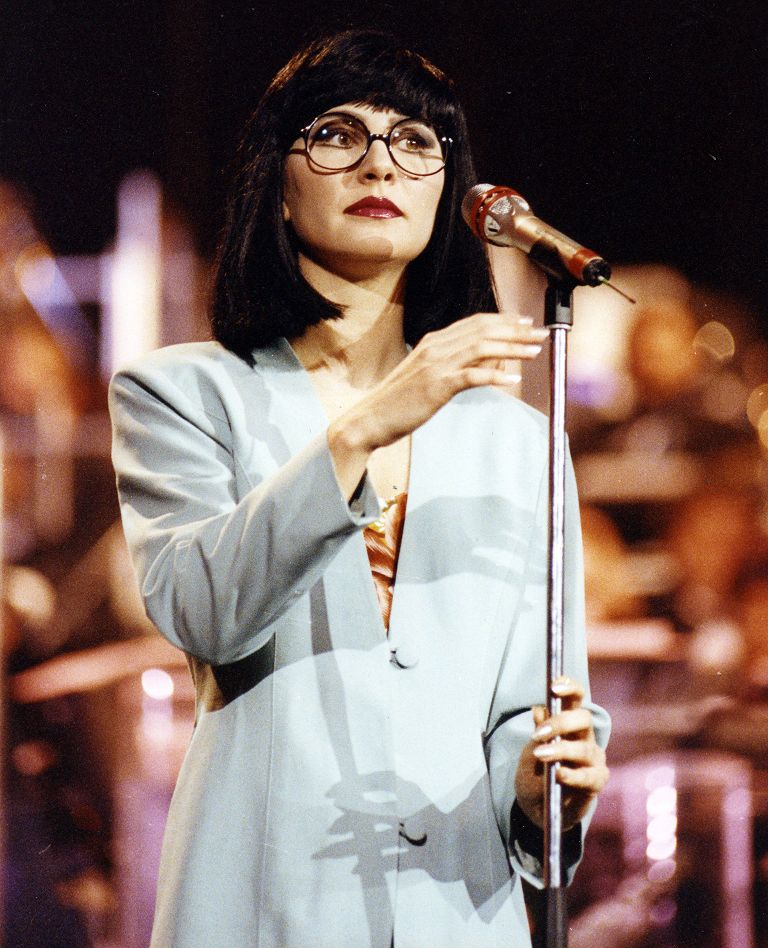 - Irene Fargo durante l’esibizione al teatro Ariston di Sanremo nel 1991
